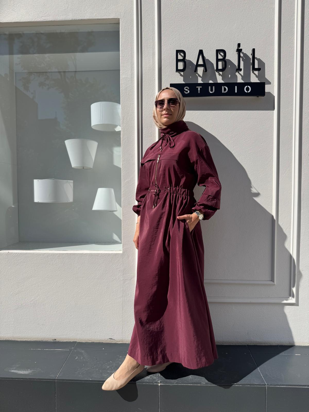 25025009 Devrik Yaka Fermuar Detaylı Kadın Elbise Bordo (25025009)