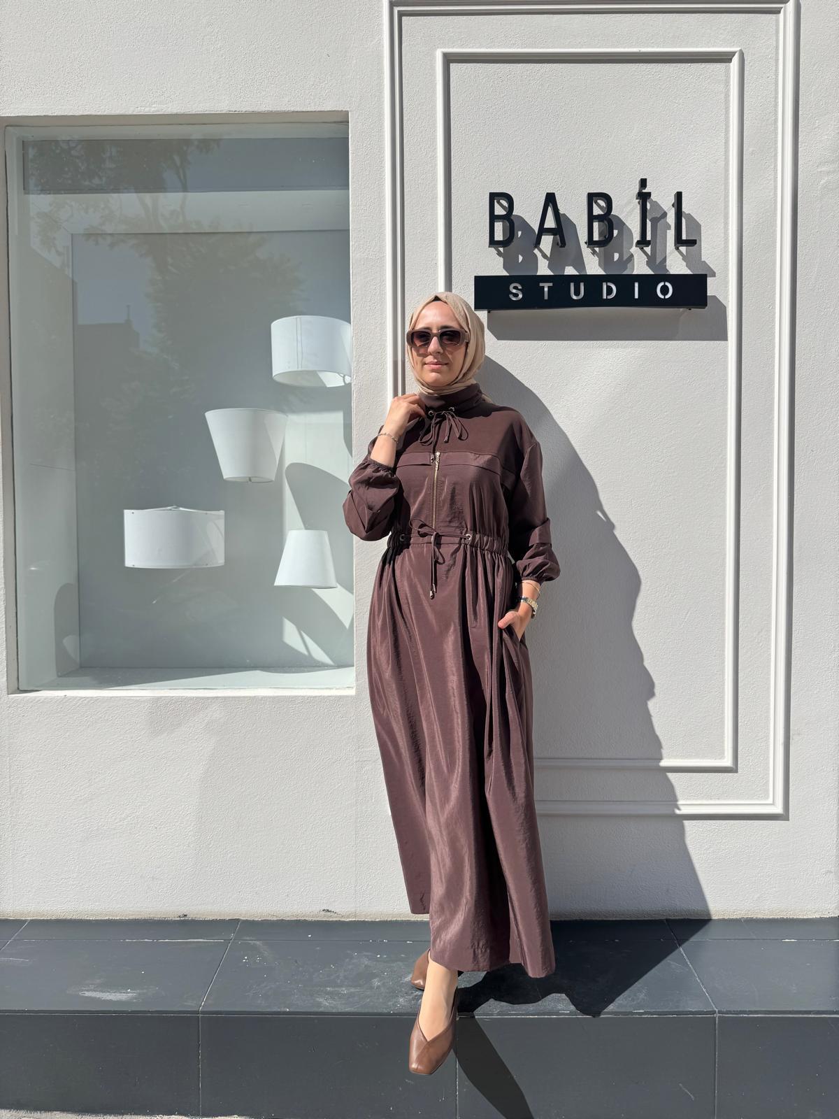25025009 Devrik Yaka Fermuar Detaylı Kadın Elbise Kahve (25025009)