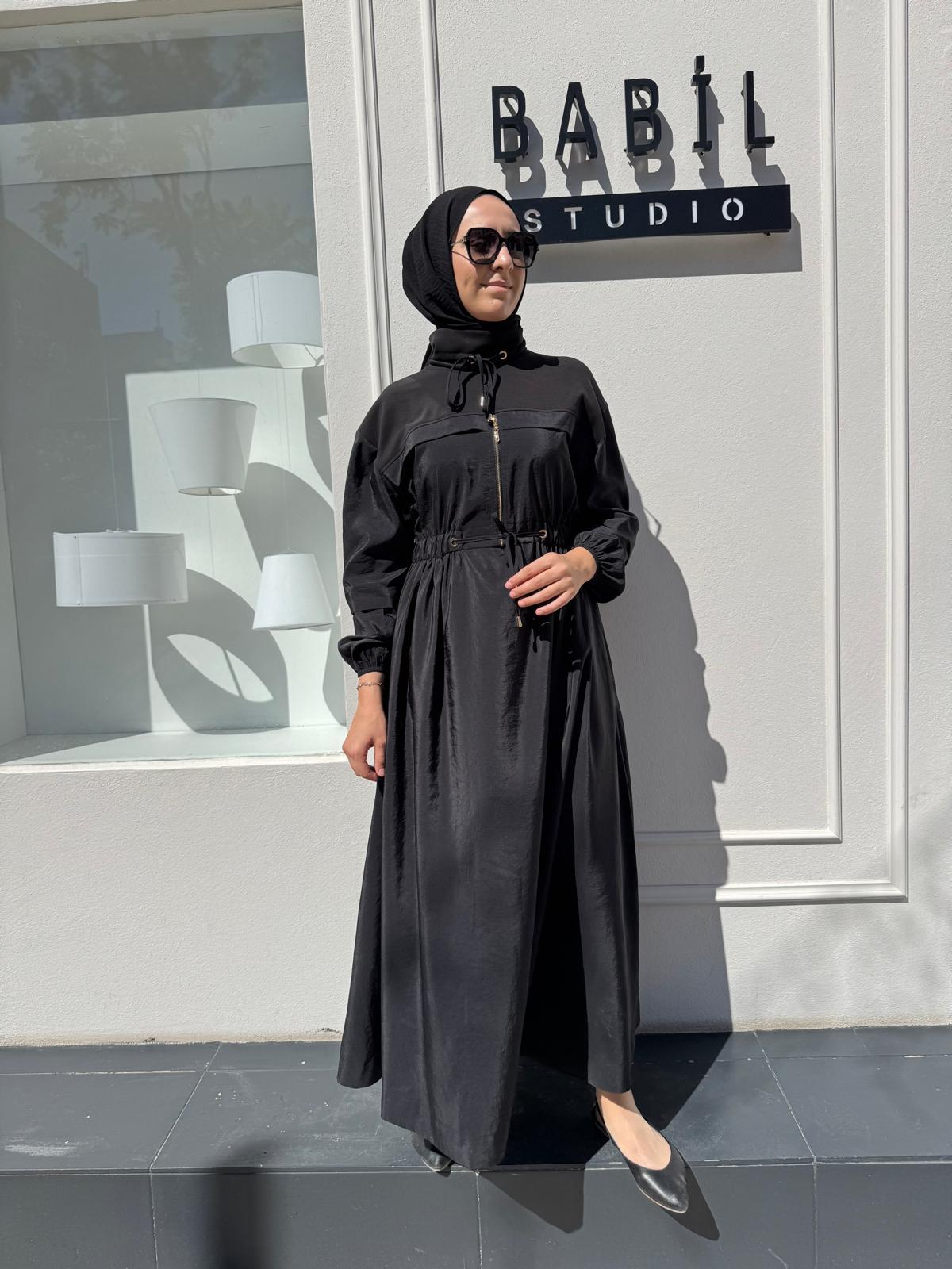 25025009 Devrik Yaka Fermuar Detaylı Kadın Elbise Siyah (25025009)