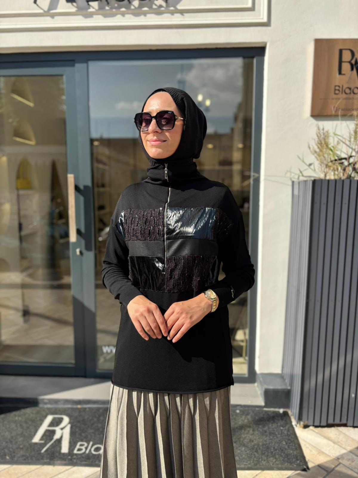 38001 Önü Parça Desenli Kadın Tunik Siyah