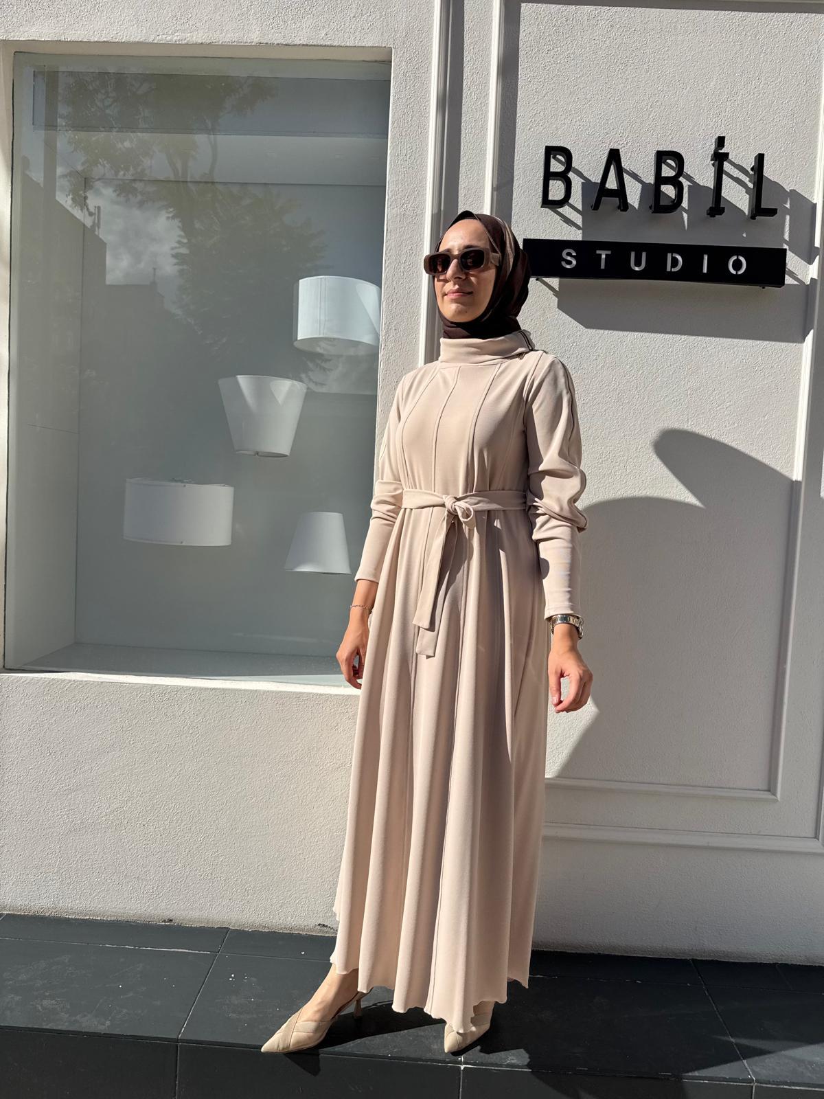 38803 Dikiş Detaylı Devrik Yaka Kadın Elbise Ekru (38803)