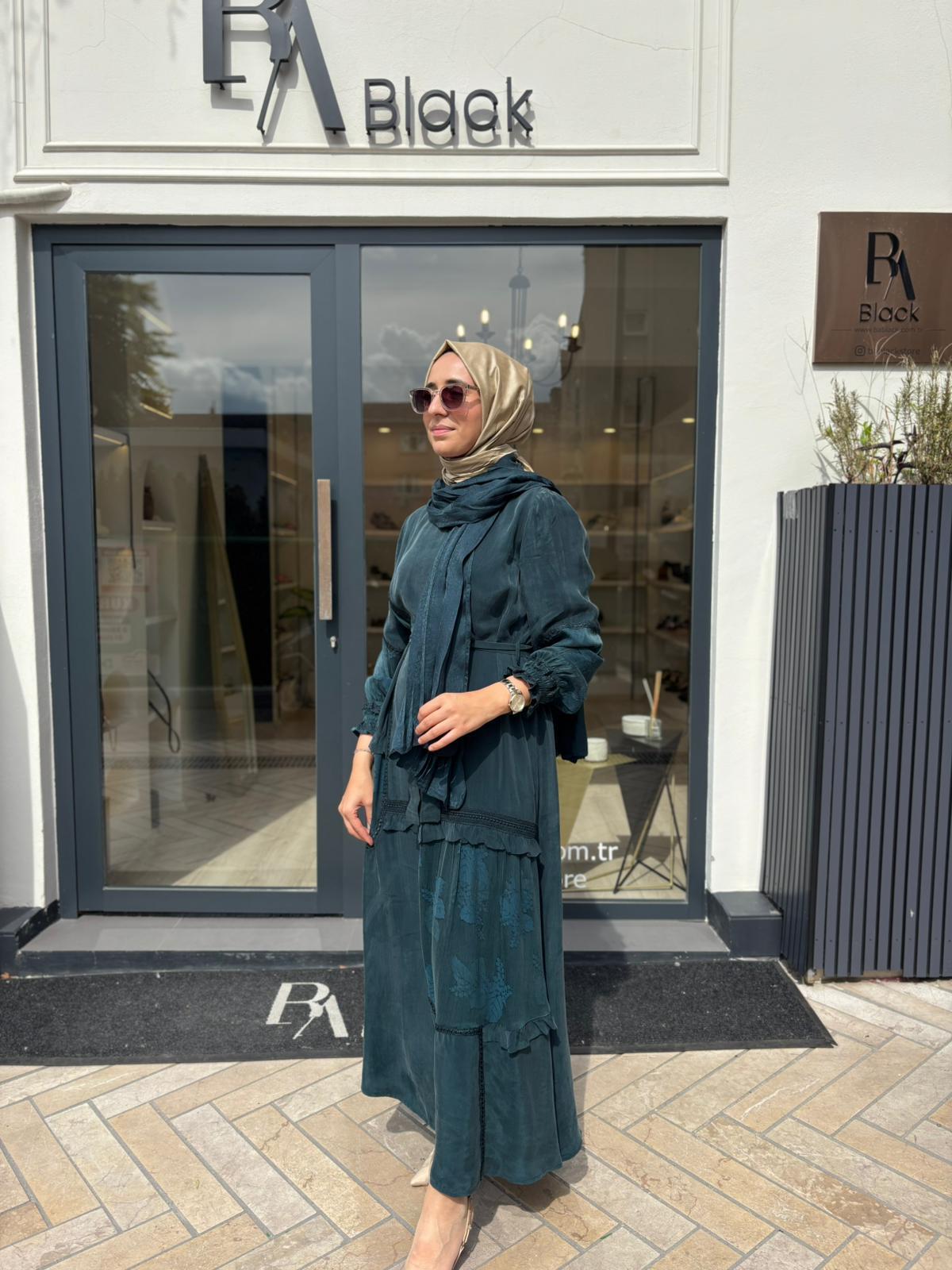 38818 Güpür Detay Kadın Elbise Zümrüt Yeşili