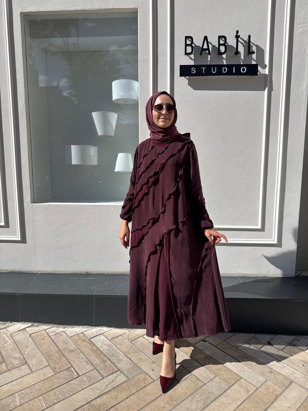 V3175 Dikiş Detaylı Fularlı Kadın Elbise Bordo (V3175)